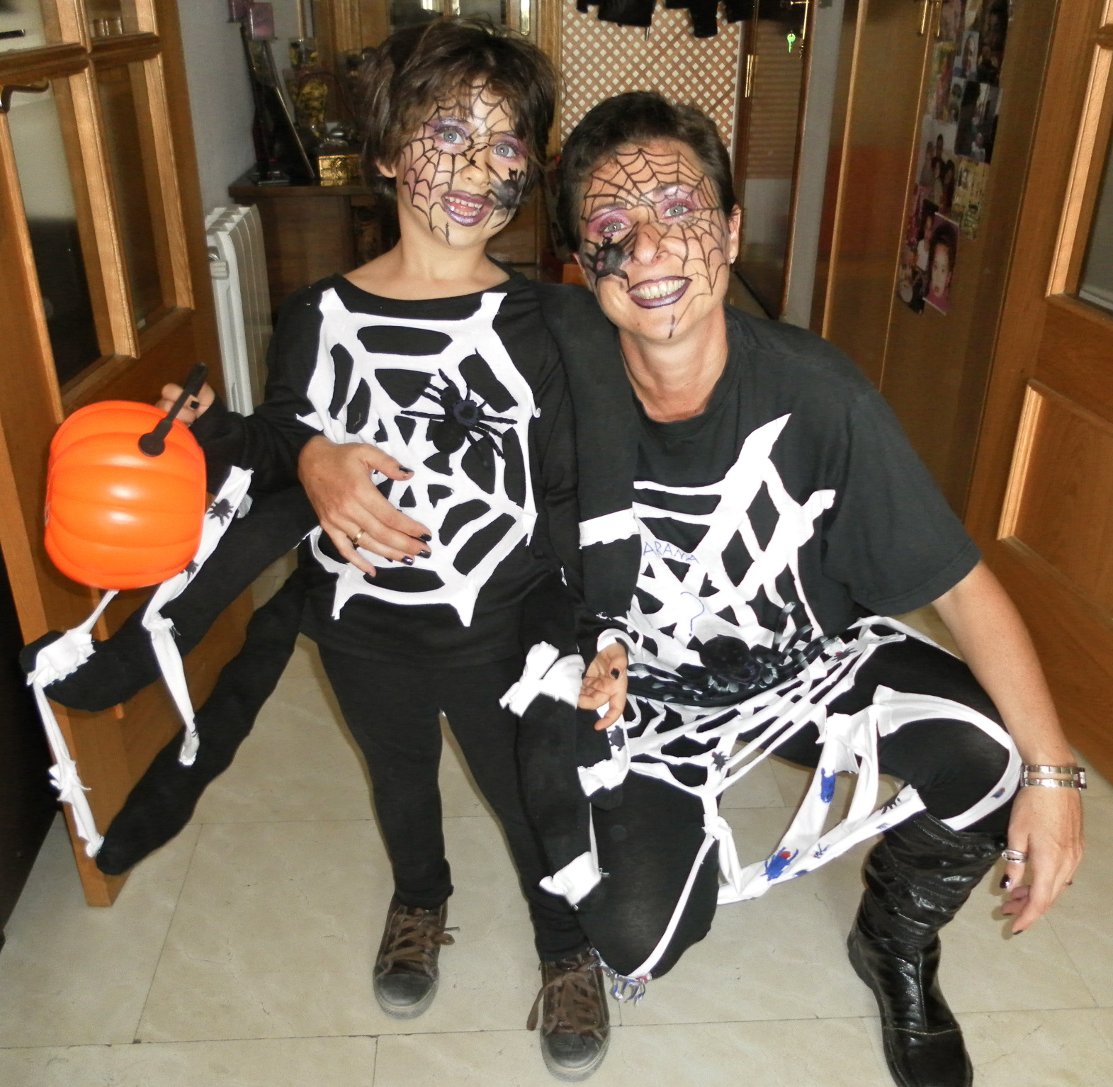 Creo que en fotos anteriores de otros días, lo que no habíais visto era las dos arañas que lleva Alejandra en el frontal (que son de plástico aunque con una textura un tanto rasposa ajajajaj), y también lleva pintadas arañas en la tela de araña (arañas que ella misma pintó). Al igual que Alejandra yo también llevaba en el frontal una araña de plástico..... aunque muy, pero que muy grande...., fijaros bien porque aunque no se ve en condiciones ahí está.......
