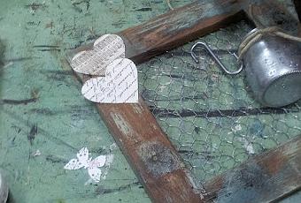 . . .con unas tablas recuperadas y la herramienta necesaria, construímos un marco. Preparamos la superficie y pintamos. En mi caso, como las tablas ya tenían ese "Sabor Antiguo", que tanto nos gusta, no quise cubrir la madera y apliqué la técnica de pincel seco, con la brocha bastante descargada de pintura, la pasé suavemente sin apenas tocar la madera. Y para finalizar "estopa" para sacarle brillo. Rematamos el fondo del marco con tela de gallinero, y unos corazones de papel para decorar.