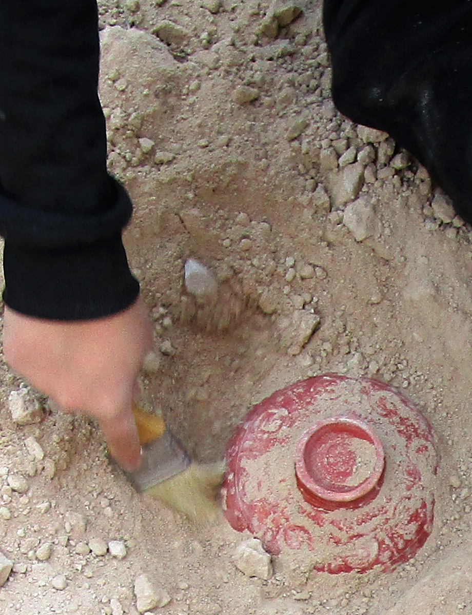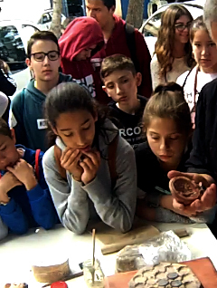 Simulación del hallazgo de cerámica romana, terra sigillata. En esta ocasión, junto al taller de prehistoria, se llevaron a cabo talleres de acuñación de moneda y de fabricación de lucernas romanas.