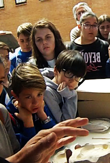 Alumnos muy interesados en aprender.La demostración se amplió en sus contenidos, abarcando una lección de historia de la iluminación artificial, y una historia de la moneda.