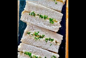 4. Entonces, untamos la mantequilla por la parte interior de nuestras rebanadas de pan, rellenamos, emparedamos, cortamos los bordes, los partimos por la mitad y servimos. Podemos echar un poquito de cebollino picado a la altura del relleno.
