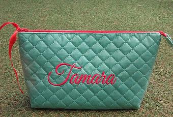Para Tamara preparé un neceser plastificado con su nombre, en un bonito tono verde agua, combinado con rojo. El forro es de vichy rojo y le da un contraste muy alegre.