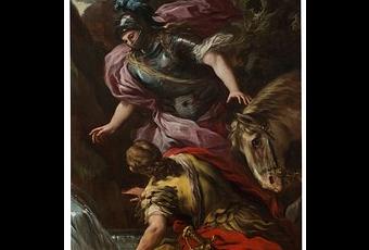 Corresponde al canto I de la Jerusalén liberada de Torcuato Tasso. Tancredo, después de la victoria de los francos frente a los persas, se detuvo en una fuente para descansar y aliviar su sed. Allí acudió también la joven Clorinda, de la que se enamoró al instante. Tancredo aparece de espaldas en la parte baja de la composición, apoyado en la fuente y volviendo su mirada hacia la joven, que irrumpe en la escena en un plano superior. Cupido, en la parte alta, lanza una flecha al joven provocando su amor.