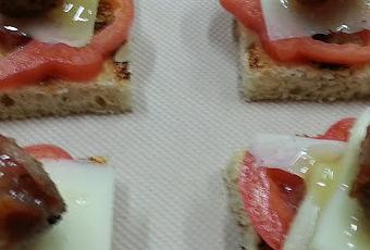2º - Cortamos el tomate y colocamos una loncha encima de cada una de las porciones de pan.3º - Cortamos unos trozos de queso y los vamos colocando encima del tomate.