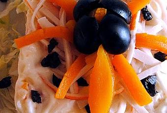 Para la decoración podemos usar: Aceitunas negras,lechuga cortada a tiras y palitos de zanahorias.