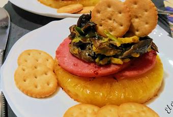 ¿Alguien piensa que preparar algo rico y original es sinónimo de mucho trabajo? Nada más lejos de la realidad, lo voy a demostrar con la receta de hoy, un pincho que os va a encantar; tapa de piña a la plancha, revuelto de setas y rodajas de jamón york, como acompañamiento le pondremos galletitas saladas, una elección espléndida con la que disfrutar a la hora del aperitivo cualquier día del año. Sé que os gusta probar cosas diferentes y novedosas, estoy segura de que la mayoría no dejaréis pasar la oportunidad de saborear esta propuesta.