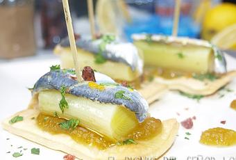 Canapé de sardinas, puerro y tomate verde4 rebanadas de pan