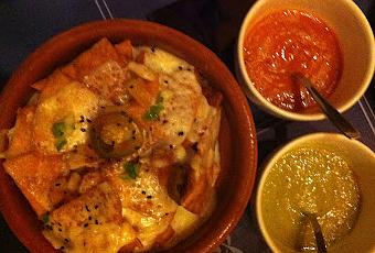 Los totopos del restaurante Milagros de Barrika siguen siendo mis preferidos, de hecho, los del Tapachula me resultaron demasiado pesados, además de que echamos en falta un pequeño bol de guacamole para acompañar, de ahí que pidiésemos la cestita de maíz con guacamole. Las quesadillas de Huitlacoche y verduritas nos gustaron a medias: yo compartía las mías con T, y a ella le gustó mucho la de Huitlacoche (un hongo mexicano) sin embargo yo no pude comerla, el sabor me resultó muy fuerte, mientras que la de verduras, me la acabé comiendo yo! Fue divertido ver como montábamos las tortillas de maíz con la chimichanga y el chilaquites, bebernos 3 litros y medio de agua, y acabar atacando los postres a pesar del empacho. Eso SÍ era un postre como los que le gustan a T: de los guarros, guarros, bien de chocolate, caramelo, y nata para rematar! M, I y T salieron muy contentas, esa noche tenían mejor estómago que yo, por eso, no quiero precipitarme en mi conclusión de este restaurante, me quedo con un "estuvo bien" sin entrar en detalle.Una cena muy completa, por menos de 22€ cada una, en el centro de Bilbao, y con muy buen ambiente, para ser un ¡miércoles!