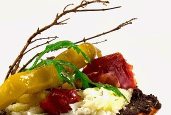 4 rebanadas de pan 50 gramos de olivada 50 gramos de taquitos de jamón ibérico 8 flores de queso Tête de Moine 4 guindillas Perejil
