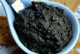 Paté de olivas negras, aperitivo típico de la Provenza francesa.- Batir en la batidora 150 grs. de aceitunas negras sin hueso, 2 cuch. de alcaparras encurtidas, 3 filetes de anchoa, 1 diente de ajo pelado, 1 cdta. de romero, 1 cdta. de tomillo y 2 cuch. aceite de oliva.