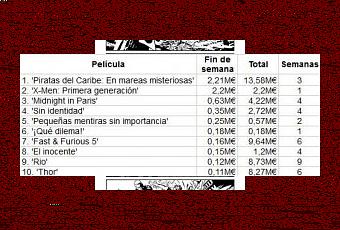 Gracias a Blog de Cine tenemos ya la recaudación oficial del pasado fin de semana en España, en la que destaca la entrada de X-Men: Primera Generación directamente al segundo puesto. En efecto, los mutantes no han podido auparse como líderes de recaudación, y la culpa es de Piratas del Caribe: En Mareas Misteriosas, que se mantiene en lo más alto después de tres semanas en la cartelera.