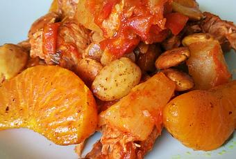 - Incorporamos las mandarinas con almendras a la sartén con los taquitos, mezclamos y servimos.