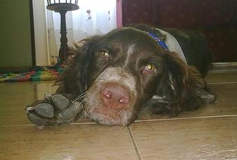 El estado era lamentable, tenía una pata totalmente inútil, quemaduras de asfalto, seca como una pasa, llena de bichos...mi intención fue ayudarla así q le di agua y demás, pero el coche lo llevaba cargado en ese momento, fui hasta mi casa muy despacito por un camino q yo conocía y le dije "vamos chica que tú puedes!",así q a tres patas (dos trasera y una delantera) se vino 3km y medio detrás del coche despacio. Cuando llegué descargué el coche y la llevé al veterinario, pues tenía la pata desencajada, echa un cristo de rozaduras de la carretera y muy muy seca. La durmieron, le apañaron la patita y las heridas y la desparasitaron.Ahora mismo está con la rehabilitación, y hasta que no se cure al 100% estará junto a mí, pero necesito encontrarle adopción para cuando se recupere.