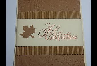 Tonos marrones, pensando un poco en que quedan un par de semanas para que llegue el otoño y que estos tonos son más masculinos. Hacerlo fue muy sencillo, con una cartulina texturizada hice el emboss de relojes y engranajes, utilicé cartón corrugado y estampé la frase de felicitación en color cobre y luego con polvos de embossing quedó el relieve. La decoración la hice con una hoja troquelada en cartulina texturizada.