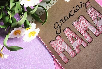 Con el cúter de nuevo, recorta el hueco de las letras para poner debajo una base de color con la tira de encaje pegada. Pega por dentro otra cartulina del color que te guste para poder escribir sobre ella la disculpa a tu madre por este regalo tan cutre, pero ojo, siempre con mucho amor. :D