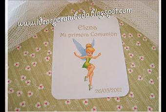 Elena se puso en contacto conmigo porque su hija hace la primera comunión este año y quería repartir unos recordatorios especiales, tenía claro que tenía que ser algo moderno pero a la vez infantil y nada de muñecas vestidas de comunión, quería que fuera diferente, original.Después de trabajar en varios bocetos eligió a Campanilla como protagonista, además a su hija Elena (se llaman las dos igual) le encanta este personaje de cuento.