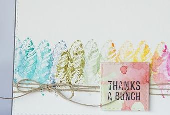 Estampé una de las plumas pequeñas del set “Feathers” de Artemio (10001192) con tintas Distress: “picked raspberry”, “mustard seed”, “wild honey”, “bundled sage”, “peeled Paint”, “faded jeans” y “broken china”. Para darles un toque de acuarela primero aplique la tinta al sello después le eché un poco de agua con un aplicador en spray y luego lo estampé en el papel acuarela. Que troquelé con el rectángulo más grande del set “stitched rectangles” (SSSD111455).