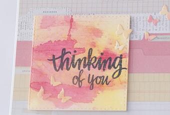 La tarjeta de hoy tiene papel de acuarela y el fondo es de la colección de Crate paper “notes & things” (#683548). El papel de acuarela lo pinté con Distress “picked raspberry” y “mustard seed” y muchaaa agua. Los troqueles que he usado son “Stitched Squares” (SSSD111454) para el panel central y los retales que quedaron del papel de acuarela pintado el troquel de Memory box “butterfly delights” (98130) para añadir las maripositas.