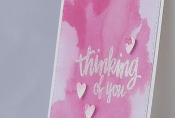Esta vez he jugado solo con un color de tinta Distress “Picked raspberry”sobre el papel de acuarela.Pero antes de empezar a jugar con el agua y la tinta, estampé el mensaje “Thinking of you” del set Hand lettered winter wishes (SSS101494) con Versamark y polvos de embossing Zing “white” efecto opaco.