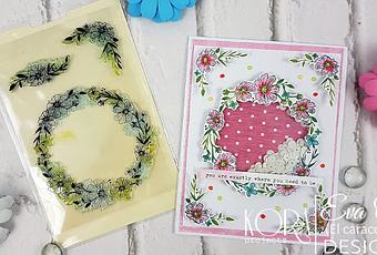 La primera tarjeta consiste en una shaker card. Para elaborarla he usado el pack de sellos “March”. He pintado y recortado los sellos para crear esta bonita composición. También he usado como base de decoración un papel decorado de Kora de la colección “Princess Garden”