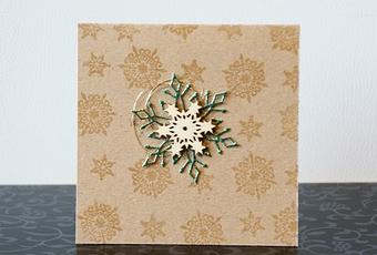 A esta primera le hice el fondo de copos de nieve con los que vienen en el set de Bo Bunny “Snow fall” (SF477), estampados con tinta versamark y polvos embossing transparentes. Y el centro es un copo de nieve troquelado en cartulina de purpurina verde y un copo de nieve de madera de Kars.