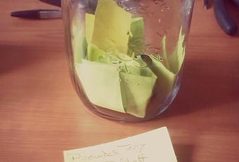 El bote es un bote de conservas que en su momento contuvo un cerebro para diseccionar (me hacía gracia la idea). Lo lavé bien varias veces y decoré la tapa con washi-tape porque me parecía un poco soso, y simplemente voy metiendo los papelitos de colores.