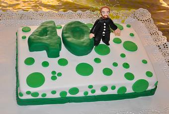 Esta tarta la hice para el marido de una amiga.La quiso blanca y verde, numero 40 de bizcocho , lunares y con un muñequito.¡¡ Felicidades¡¡¡¡Espero que hayáis pasado un gran día en familia.