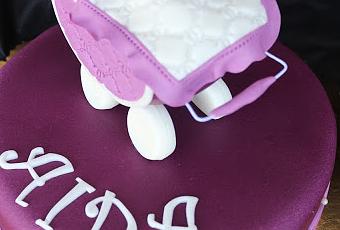 Tarta bautizo lila con cochecito para aida