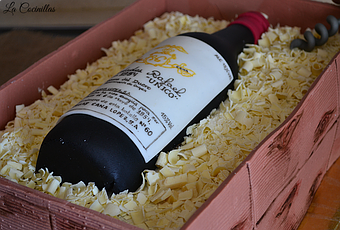 En total para toda la decoración de la tarta necesite unos 2 kilos de fondant, lo que mas fondant se llevo fueron los tablones de la caja de madera ya que los tuve que hacer bastante gruesos para que aguantaran bien de pie, el efecto de madera lo logre con ayuda de unos texturizadores y pintura comestible en polvo. la botella la hice utilizando como molde una botella de vino de verdad y dejándola secar bien unos cincos días y con ayuda del cmc , la etiqueta la realice con ayuda de unos rotuladores de tinta comestible, trabajo de chinos¡¡ jejeje pero el resultado bien mereció la pena había gente que preguntaba si la botella era de verdad y alucinaron con la tarta, la verdad es que después de hacer algo así te sientes capaz de hacer cualquier tarta que te propongan.