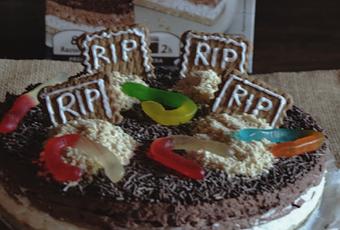 Partir las galletas tostadas rectangulares por la mitad y escribir RIP con ayuda del lápiz para reposteria y ponerlas sobre la tarta, justo donde se han puesto las tumbas de galleta. Al ser textura tipo mousse es muy fácil que se sostenga.
