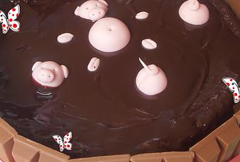 Desde que ví esta tarta me moría de ganas de hacerla, principalmente por hacer algo con pasta fondant por primera vez a ver qué tal se me daba manejarla. Y la verdad es que es muy fácil, exactamente igual que la plastilina que usábamos cuando éramos pequeños. Ha sido muy divertido modelar los cerditos y meterlos en su baño de barro!!!.