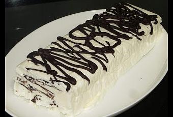 Ingredientes:- 200 gramos de chocolate negro (para las láminas y la cobertura).- 500 mililitros de nata.- 3 claras de huevos.- 120 gramos de azúcar.Elaboración:Lo primero que hacemos son las láminas de chocolate. Derretimos 150 gramos de chocolate en el microondas y en un papel de horno vamos realizando nuestras láminas de chocolate del mismo grosor y tamaño que nuestro molde. Las metemos al frigorífico para que se enfríen. Podéis hacer de cuatro a cinco láminas de chocolate.A continuación, montamos por un lado la nata, recordar que tiene que estar bien fría tanto la nata como los utensilios a utilizar y añadimos 60 gramos de azúcar. Lo mismo hacemos con las claras de huevo y añadimos los otros 60 gramos de azúcar. Luego unimos todo con movimientos envolventes para que no se nos baje.Ahora forramos nuestro molde con papel de horno, mejor si es alargado, para que se parezca más a la original y echamos una capa de nata y una lámina de chocolate, una capa de nata y una lámina de chocolate, así hasta terminar la tarta que lo tenéis que hacer con nata. Luego la tapáis con el mismo papel de horno o papel albal y la metéis al congelador hasta el día siguiente. Antes de servirla derretís el chocolate que os quedaba y le ponéis con una cuchara o un biberón hilos de chocolate por encima, en este caso he añadido un ocho por los años que llevamos de desafío y ya está lista para servir.