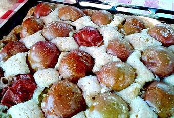 4º Antes de ponerlo en el horno poner por encima, con los dedos, una capa de azúcar, aceite de oliva, harina y otra capa de azúcar. 5º Cocer con el horno a 180/200 grados solo por abajo unos 40 minutos. Si no está suficientemente cocido dejarlo unos minutos más