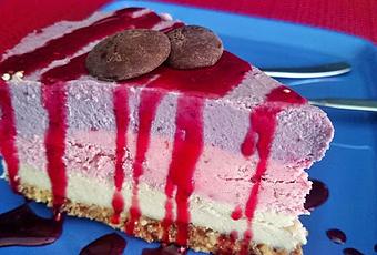 - Dividimos la masa en tres partes iguales. En la batidora vaciamos una vaina de vainilla y la batimos con la primera parte de la masa de anacardos. Vertemos la masa en el molde encima de la base. Trituramos la segunda parte de la masa con las fresas y la tercera con las moras. Vertemos la masa en el molde formando dos capas más.