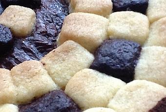 Ahora preparamos la galleta crujiente de la parte de arriba de nuestra tarta mezclando el azúcar, la harina y la mantequilla formando una masa manejable.Apartamos 1 tercio de la masa que mezclamos bien con la cucharada de cacao en polvo obteniendo la masa de galleta de chocolate.con las manos cogemos porciones pequeñas primero de la masa sin chocolate y hacemos bolitas y luego con los dedos apretamos haciendo pequeños dados de masa.Lo hacemos igual con la masa de chocolate.