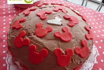 Vamos con la tarta, hice los dos bizcochos doblando las cantidades con la receta de la tarta de maltesers, exactamente igual, la cubrí con el buttercream y luego corté mickeys con fondant rojo.