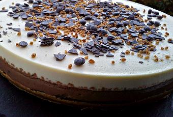 Colocamos una cazuelita al fuego y echamos el chocolate negro previamente cortado en trocitos pequeños , añadimos 250 ml de nata y 250 ml de leche y 1 sobre de cuajada y cuando el chocolate empiece a derretirse con la varilla de cocina o con la batidora mezclamos bien y una vez todo bien unido lo vertemos sobre la base de galleta colocando un cucharon en el medio para que el