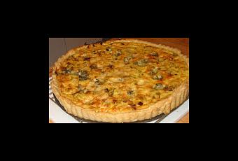 Masa. En una máquina procesadora colocar 150 gramos de harina, 50 gramos de harina de maíz, 100 gr de manteca fría cortada en dados, la sal y la pimienta hasta obtener un arenado. Agregar 1 huevo huevo y procesar de nuevo hasta tener una masa lisa. Envolver en un papel film y la llevar a heladera 1 hora.Estirar, forrar un molde de 26 cm de ancho previamente enmantecado y enharinado. Pinchar con tenedor la base y dejar cocinar durante 10 minutos en horno moderado hasta dorar. Relleno Picar 200 gr apio y 1 cebolla, saltea en un poco de manteca.Pisar en un bol 100 gr de queso azul con un tenedor. Al queso agregar después 150 gr de muzzarela rallada, 10o gr de nueces picadas, 3 huevos, el apio y la cebolla y pote entero de queso crema . Sal y pimienta.Cubrir con esta preparación la masa y cocinar en el mismo horno unos 20 minutos.