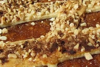 5- Forrar un molde de quiche con la masa quebrada, pinchar con un tenedor, extender el relleno, y adornar con una rejilla de masa, haciendo tiras, espolvorear almendra en granillo y canela en polvo.