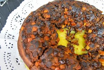- 4 huevos.- 200ml. de nata para montar.- 3 medidas del bote de la nata de harina.- 2 medidas del bote de la nata de azúcar.- 1 medida del bote de la nata de aceite de oliva.- 1 sobre de levadura.- 2 cucharas de cacao.- 6 vainas de cardamomo.- Pepitas de chocolate.- Cáscara de naranja confitada en dados.- Mantequilla para el molde.(PARA LA CREMA DE NARANJA)- 80g de maicena.- 375g de azúcar.