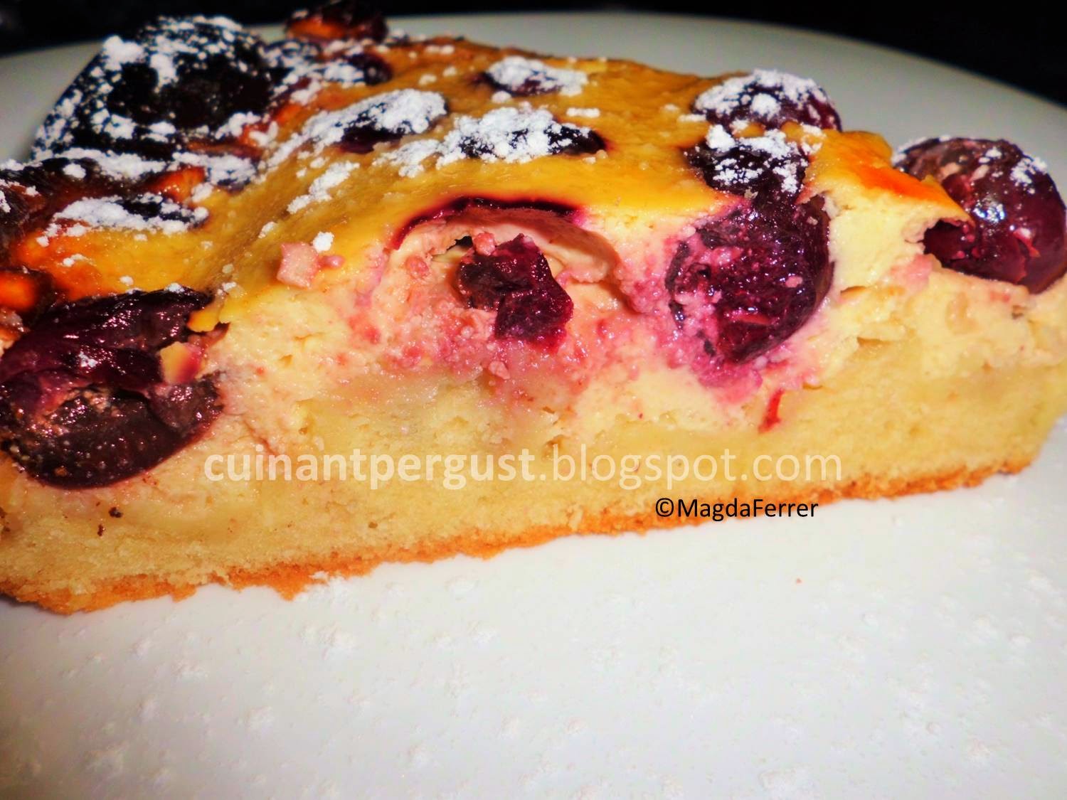 Disponer las cerezas en el relleno de queso fresco. Hornear a 150ºC en modo ventilador unos 30-35 minutos, hasta que al pinchar con un palillo éste salga limpio. Si se empieza a tostar demasiado por encima y aún no está cocido del todo, cubrir con papel de aluminio. Dejar enfriar brevemente antes de desmoldar y dejar enfriar completamente antes de servir. Servir la tarta espolvoreada con azúcar glas.