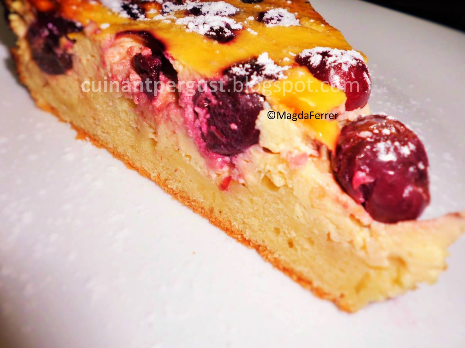 Ingredientes:350 gr. de cerezas deshuesadas100 gr. de mantequilla125 gr. de azúcar10 gr. de azúcar vainillada1 chorrito de esencia de vainilla1 pizca de sal6 huevos1 ½ cucharadita de levadura Royal150 gr. de harina500 gr. de queso fresco batido desnatado 0% (materia grasa)1 sobre de preparado para flan100 gr. de almendras (molidas, a cubitos o fileteadas)