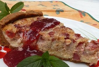 Vertemos el relleno sobre la tarta y a continuación repartimos las cerezas deshuesadas sobre toda la superficie.