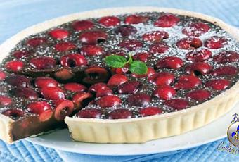 Fundir el Chocolate junto a la nata al baño María hasta que esté totalmente diluido, añadir la mantequilla y ligar bien, espera que se enfríe casi del todo, más bien un poco tibio y echar en la masa, encima colocamos las Cerezas que habremos deshuesado con antelación.