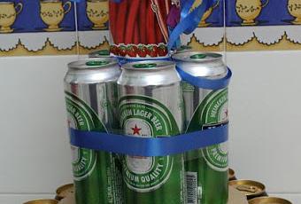 ¡Porque no hacia una tarta de cerveza! Yo había visto esta idea en varias ocasiones en Pinteres.com y navegando por la web. Así que contamos las cervezas que necesitaríamos para hacer una tarta de latas de cerveza de dos plantas. También cogimos una botella para que hiciera de pilar y las chucherías favoritas de mi marido como colofón.