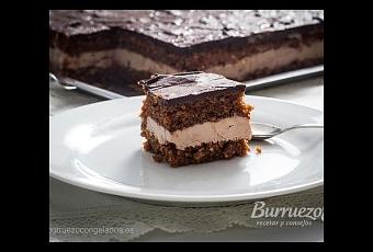 Colocar en una bandeja la mitad del bizcocho, calar ligeramente con la mitad del ron, cubrirla con el relleno preparado y disponer suavemente sobre este la otra mitad del bizcocho, calándolo una vez colocado, con la otra mitad del ron. Dejar en la nevera reposando al menos 30 minutos.