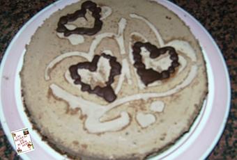 Una vez cuajada desamoldamos con cuidado y adornamos con el chocolate reservado yo la iba adornar con el pero lo he guardado también que no lo encuentro jajajaja con que lo he adornado con tres corazones de chocolate que tenia hechos y un poco de cola-cao no ha quedado como quería pero como para quien he hecho la tarta le ha parecido bien con eso me quedootra vez la adornare mejor .