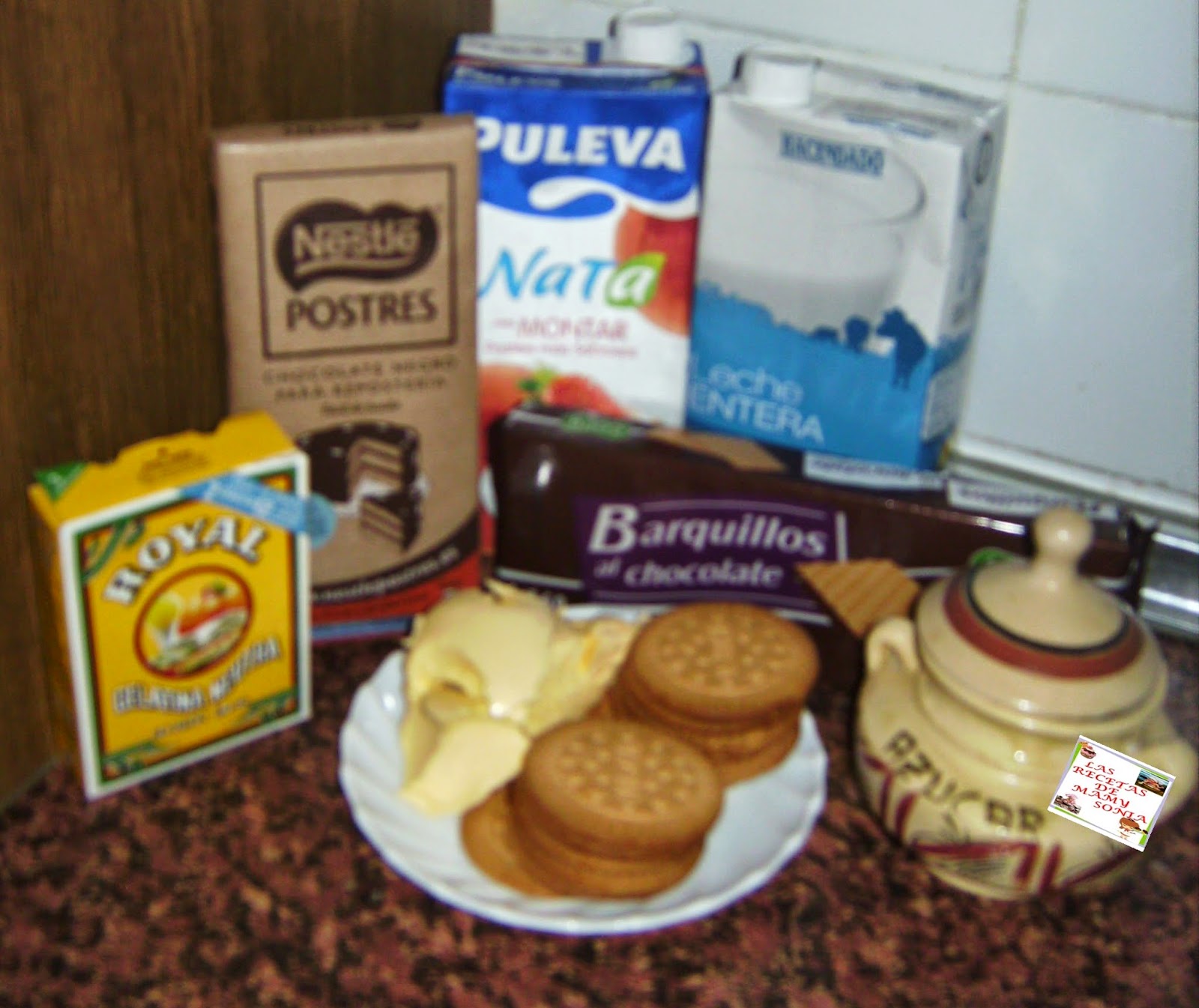 _ 250 gr. de barquillos de chocolate(puedes utilizar la típica galleta María)(Comentaros que me equivoque y compre solo un paquete y son dos es por ello que puse en galletas Maria lo que me faltaba)