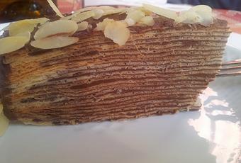 En un plato ponemos papel de horno (las obleas se rompen fácilmente, por lo que ponemos el papel de horno y encima montamos la tarta. Cuando queramos presentarla, sólo tendremos que retirar el papel) y vamos colocando una oblea, una capa de chocolate y así hasta que terminemos con todo. Dejamos una buena ración de chocolate para la última capa y para poder decorar los laterales.