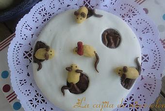 Hace ya bastante que vi los ratoncillos de mazapán decorando una tarta, desde entonces los he visto en varias ocasiones, siempre preparados para tartas infantiles. Hace unos días, cuando empecé a pensar una tarta para mi hermana Lourdes me acordé de los simpáticos roedores, y le quise hacer un guiño con ellos. Mi hermana es una mujer con un coraje increible y una madraza maravillosa, y para ella es esta tarta de chocolate intenso coronada por una ratita presumida ;)